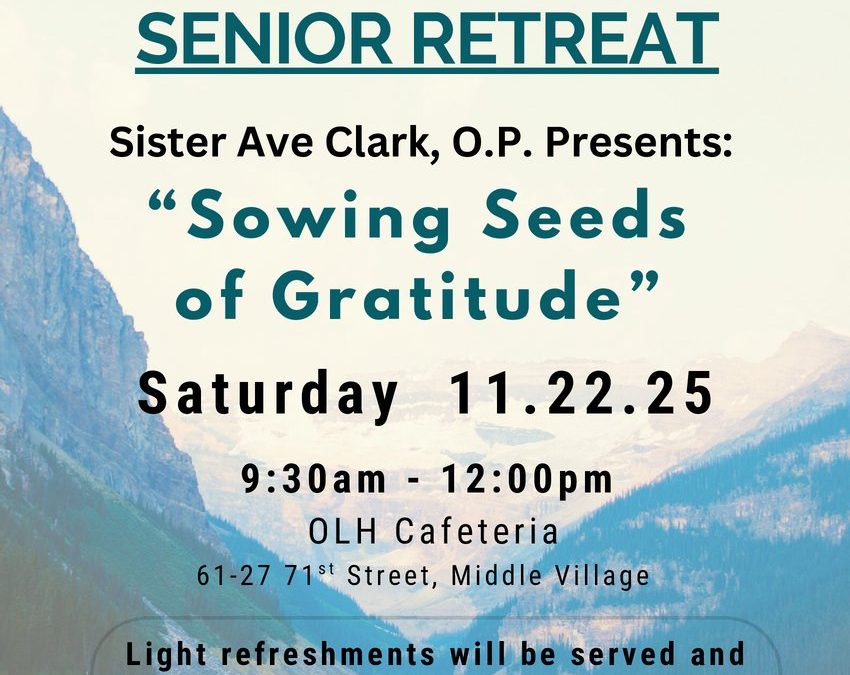 Senior Retreat: Seeds of Gratitude Nov 1, 2025 | News & Events Facebook Twitter At Our Lady of Hope, Middle Village 9:30 AM – Noon